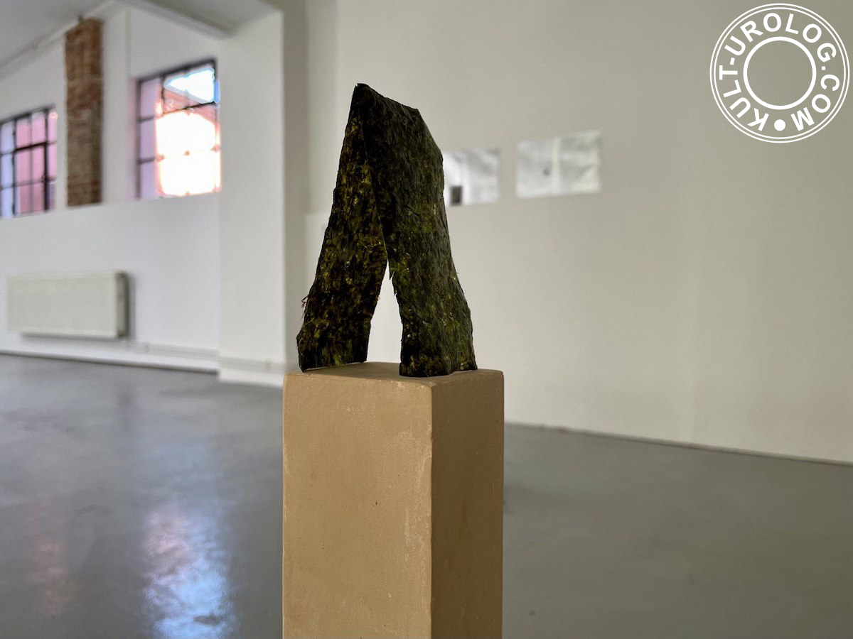 There was a strong smell of nori in the gallery, actually. Because nature is fair, and there is a Euro-American analogy for the milk intolerance — seaweed, and that’s why (so familiar) stacks of green sheets were among the exhibits. Since for the artist the surface of nori is also an indicator of the difference in humidity between East and West, it was supposed that during the exhibition its original state will be disturbed and changed under the influence of the atmosphere of the exhibition space (the edges will bend, the sheets will warp, and so on; I don’t know whether the smell and any dust, for example, were taken into account).